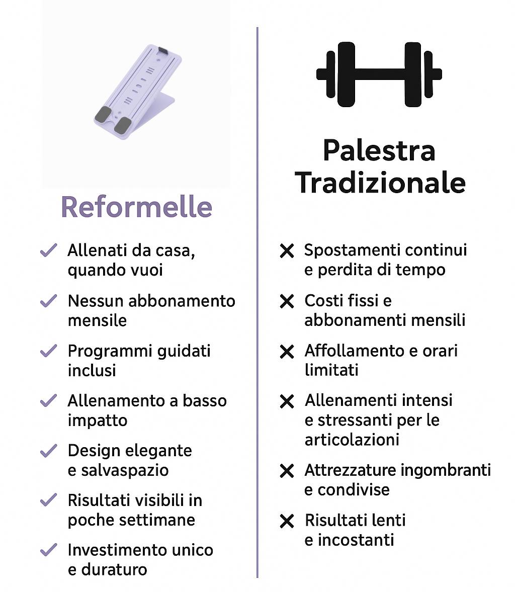 Investi una sola volta nel tuo benessere. Nessun abbonamento mensile, nessun vincolo. Solo la libertà di allenarti quando vuoi, quanto vuoi, per sempre. A differenza delle lezioni in studio, che richiedono costi continui, con Reformelle ottieni la stessa qualità professionale in un formato pratico, conveniente e duraturo. È la soluzione definitiva per chi vuole risparmiare, restare in forma e sentirsi bene nel proprio corpo.